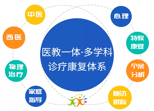 医教一体,多学科诊疗康复体系以多学科介入生物治疗、中成药治疗、康复治疗、行为矫正、特殊教育和心理疏导相结合的综合治疗体系。