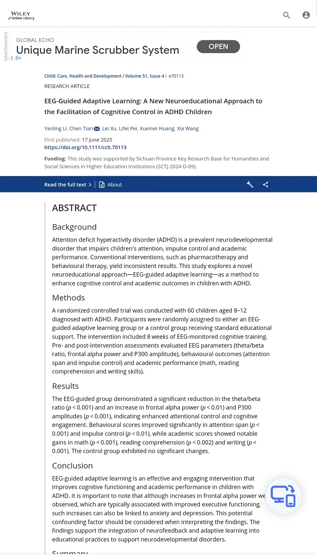 7月,西南儿童医院一城两院科研院长徐磊院长、王霞主任与吉利学院李妍伶博士团队联合所著的研究论文《EEG-Guided Adaptive Learning: A New Neuroeducational Approach to the Facilitation of Cognitive Control in ADHD Children》(EEG引导的自适应学习:一种促进ADHD儿童认知控制的新型神经教育方法),正式发表于国际权威期刊《Child: Care, Health and Development》,这是西南儿童康复医院2025年度发表的第5篇SCI论文,该论文为注意缺陷多动障碍(ADHD)儿童的精准化康复干预提供了全新的理论支撑与实践路径,这也是医院在临床科研创新与转化取得的又一次突破。